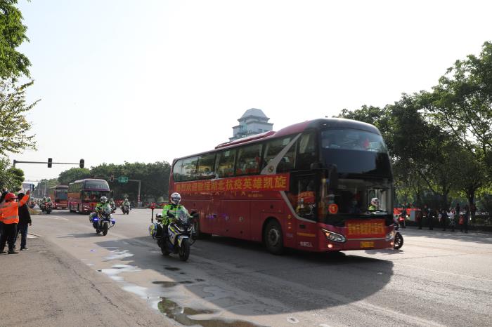 下午16點整,載著賀州支援湖北醫(yī)療隊的大巴車在33輛摩托車鐵騎、兩輛警車的引導護航下駛?cè)胭R州大道,警燈閃爍、警笛嘹亮,沿途市民揮舞國旗,夾道歡迎,高聲歡呼,壽城人民用最高禮遇,最深敬意,迎接英雄凱旋,表達對英雄的敬意。
