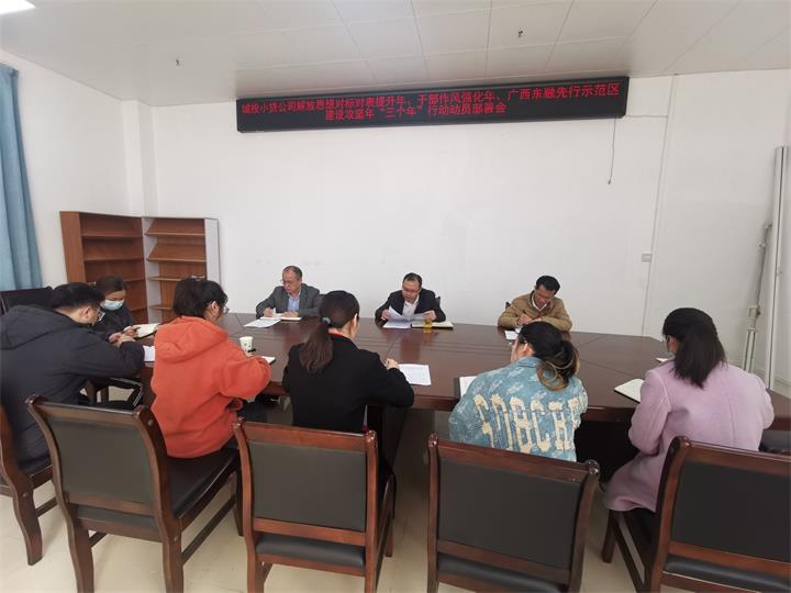 小貸公司召開本公司“三個年”動員部署會,要求公司上下要進一步解放思想,強化作風(fēng)建設(shè),重實效、強實干、抓落實,以“三個年”活動為抓手,聚焦信貸業(yè)務(wù)發(fā)展加油干、強化風(fēng)險防控不松勁、改進干部作風(fēng)不停步,以作風(fēng)的轉(zhuǎn)變推動公司高質(zhì)量發(fā)展。