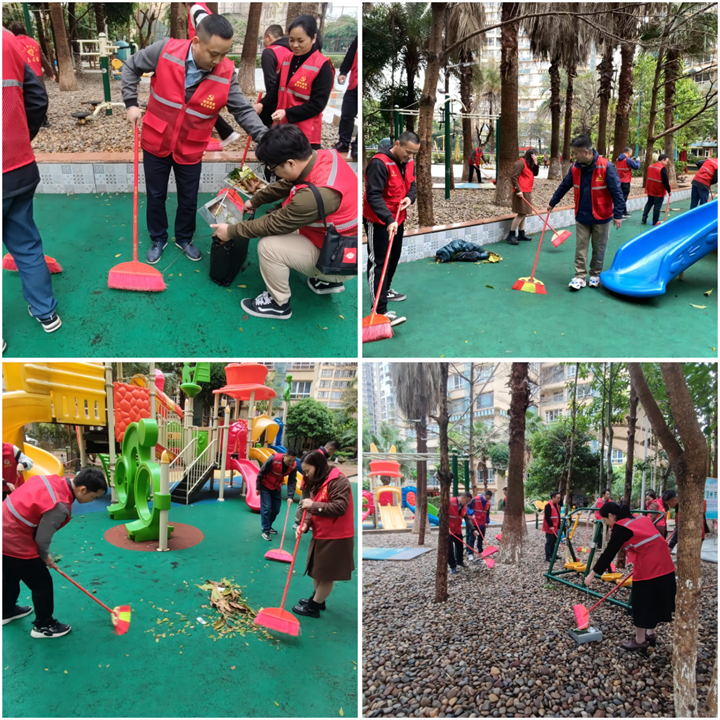 活動(dòng)中,支部黨員與社區(qū)志愿者們分工協(xié)作,干勁十足,深入衛(wèi)生死角,拿起掃帚等工具清理居民小區(qū)健身器材區(qū)與孩子們游樂區(qū)散落的枝葉與垃圾。在志愿者們的共同努力下,健身區(qū)與游樂區(qū)煥然一新,提升了人居環(huán)境質(zhì)量,得到了小區(qū)居民的點(diǎn)贊,形成了“黨建引領(lǐng)、鄰里協(xié)力、共建幸福”的良好局面。