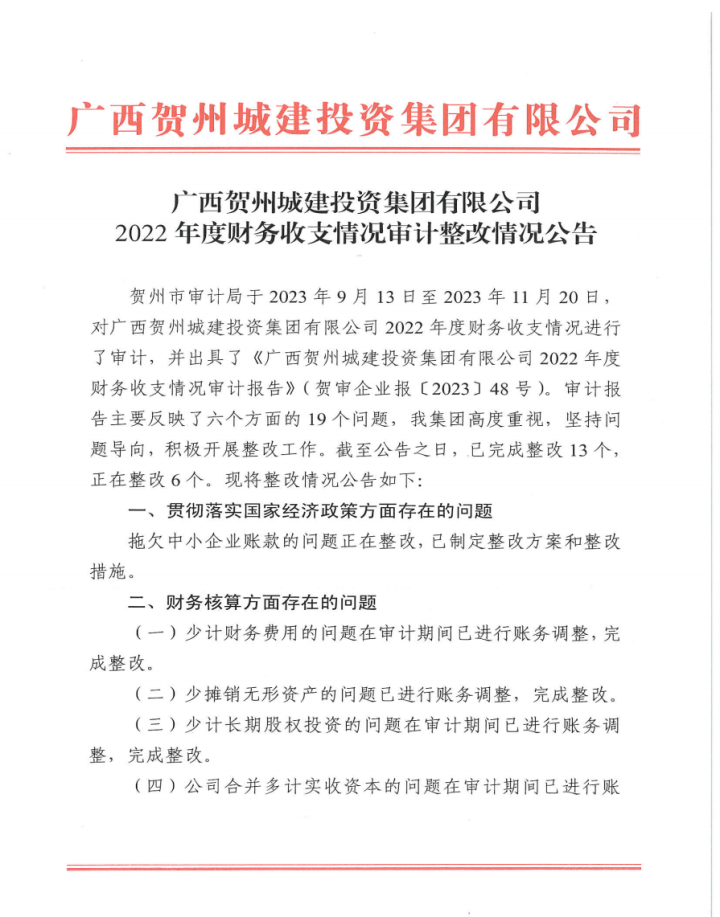 中共廣西賀州城建投資集團(tuán)有限公司委員會關(guān)于市委第四巡察組巡察反饋意見整改情況的通2025-12-30